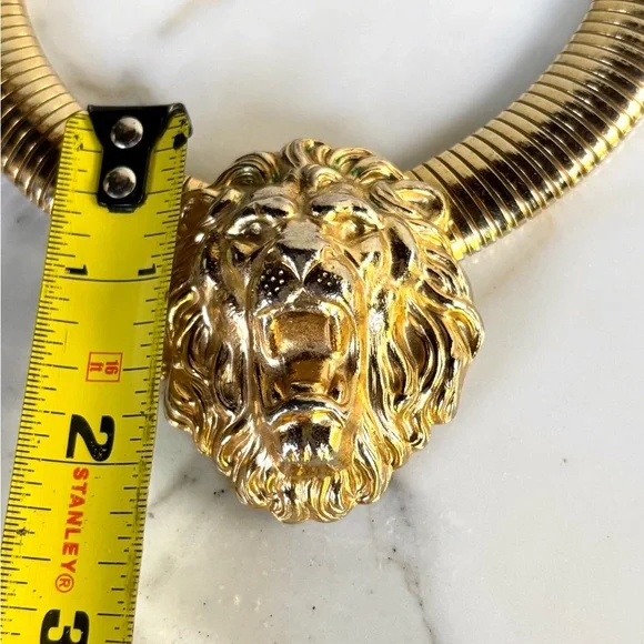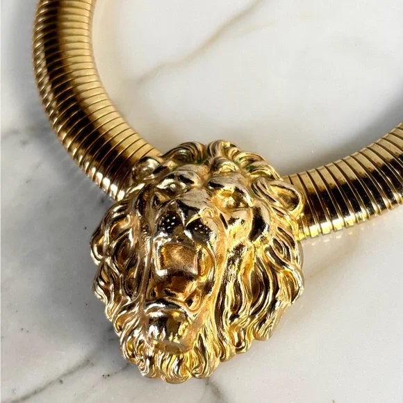 An original 1980s gorgeous piece of vintage FABULOUSNESS statement necklace like no other! To wear alone or layer with other necklaces. A bold, massive 80s tubogas omega flexible collar necklace is crowned with a regal lion’s head, mane and all. It’s giving major 1980s Bulgari and Versace vibes!Length approximately 17 inchWide tubogas omega .75 inchLion Head 2.125 inch x 1.75 inches (5.4 cm x 4.45 cm)Clasp closureUnsignedExcellent vintage conditionFinal Sale